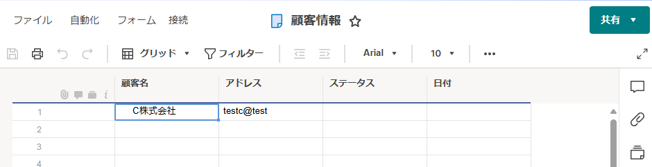 なお、この後のテスト操作のためにカラムに作成日時を作成し、テスト用に行を1つ追加してください。