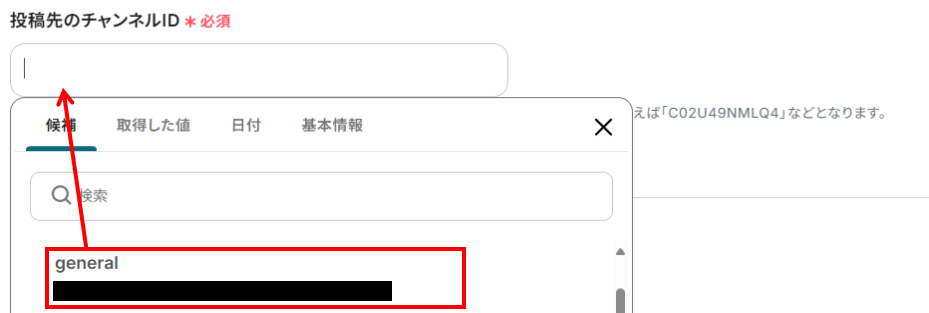 ・投稿先のチャンネルID:指定のチャンネルIDを候補から選択します。
