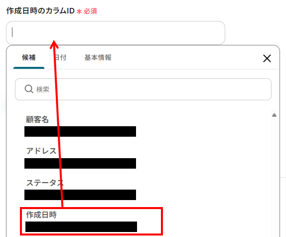 作成日時のカラムID:こちらも入力欄をクリックして、作成日時を選択しましょう。