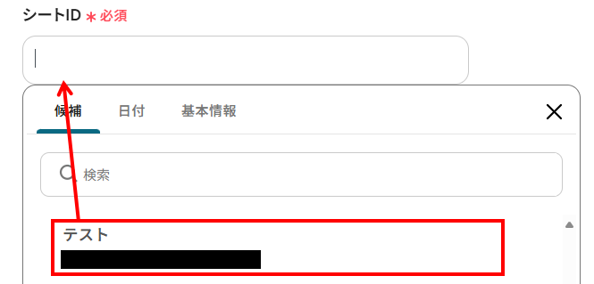 シートID:入力欄をクリックすると下記のように候補が表示されます。先ほど作成したシートを選択してください。