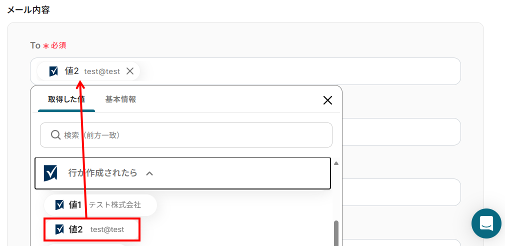 ページを下に進み、メールの内容を具体的に設定していきます。 それぞれの入力欄をクリックすると、下記のように取得した値が表示されます。各項目に合った情報を、『取得した値』を活用して入力していきましょう。