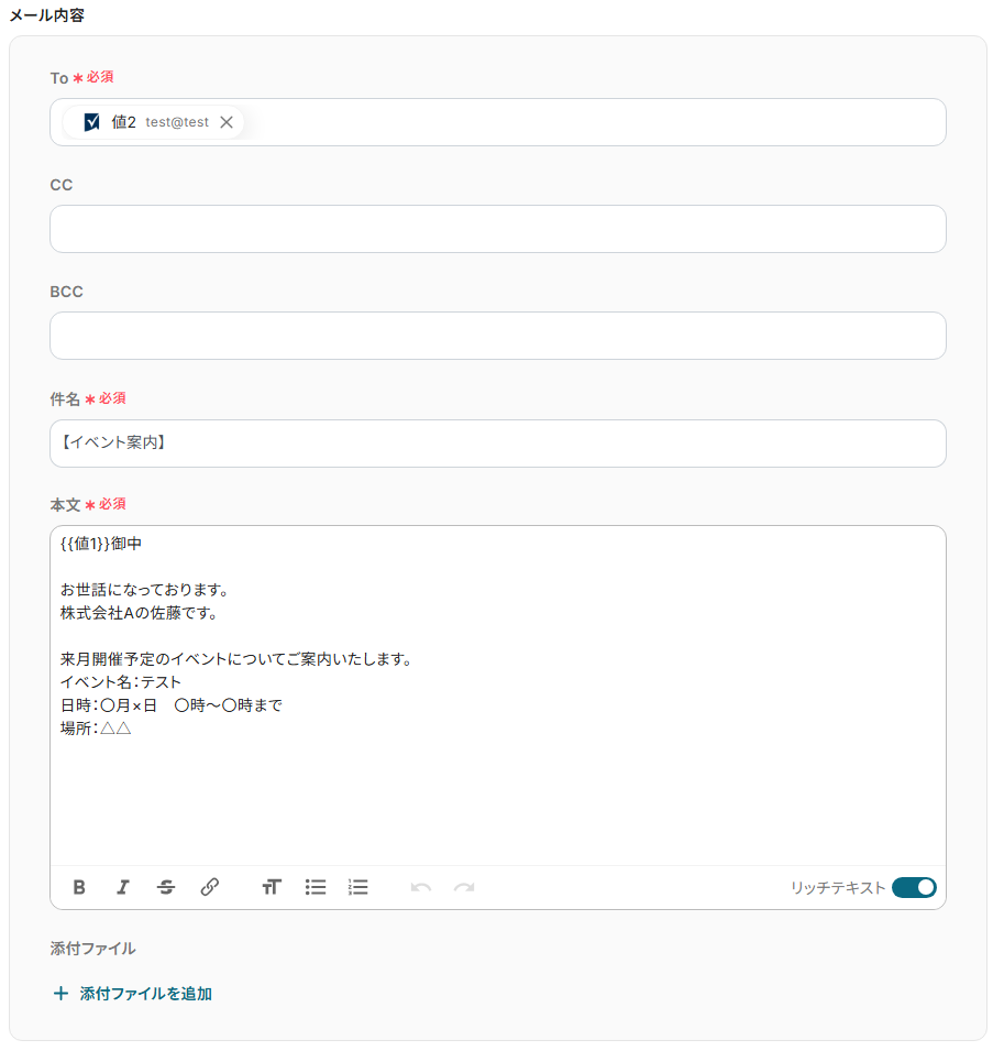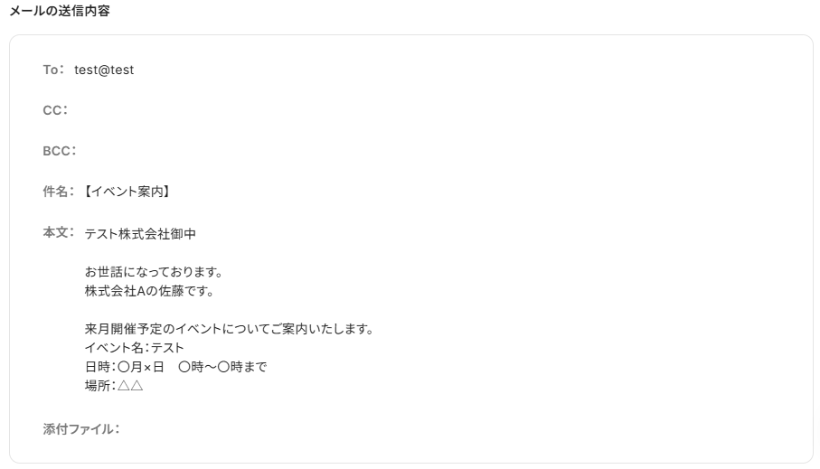 メール送信のテスト画面になるので、入力内容に誤りがないか確認してください。