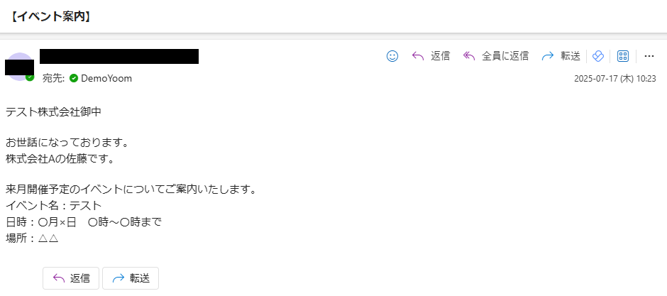 内容に問題がなければ、「テスト」を押してOutlookにメールが届いているか確認してみましょう。 下記のように設定した内容のメールが届いていればOKです。 Yoom画面に戻り、「保存する」を押して次へ進みましょう!