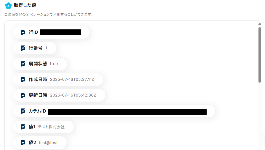 入力が完了したら、「テスト」を実行してみましょう。テストが成功すると、下記の『取得した値』が表示されます。 ここに、Smartsheetのシート情報が反映していればOKです! ※取得した値とは? 最後に、「保存する」を押して次のステップへ進みましょう。