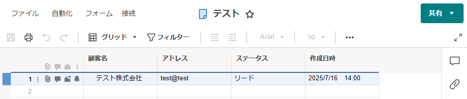 画面が切り替わったら、API接続設定のページになります。 こちらの設定の前に、トリガーとなるSmartsheetの準備をしましょう。なお、この後のテスト操作ために、カラムに作成日時を作成し、テスト用に行を1つ追加してください。(内容はテスト株式会社などの架空の情報でOKです) 今回は、下記のようなシートを準備しました。