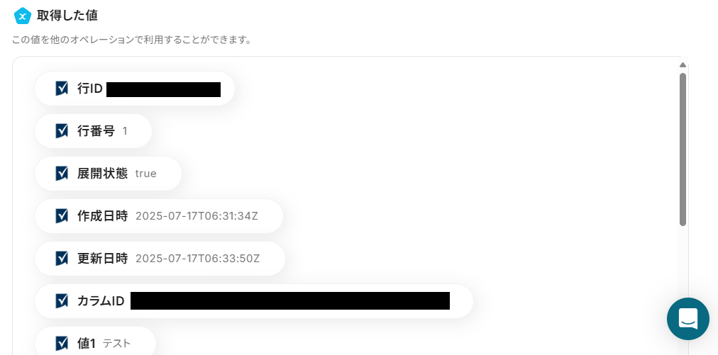 下記のように入力欄をクリックすると、取得された値が表示されるので、このアウトプットを活用して入力してもOKです!
