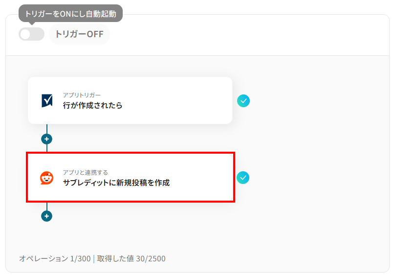 続いて、Smartsheetで抽出したデータを、Redditのサブレディットに新規投稿を作成する設定をしましょう。下記赤枠をクリックしてください。