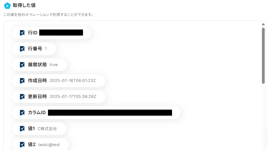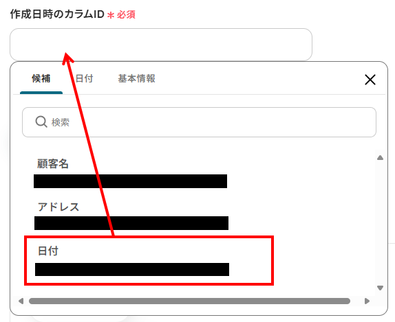 ⑮次のページで事前に設定した列名が表示されるので、各列名の欄をクリックし、⑬の担当者へ対応を依頼するオペレーションで取得した項目をそれぞれ対応した列名のところに入力します。