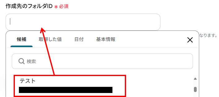 入力完了後、「テスト」をクリックし成功したら、Google Driveに新しくフォルダが作成されているはずなので確認してみましょう!