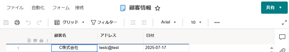 この後のテスト操作ためにカラムに作成日時を作成し、テスト用に行を1つ追加してください。(内容はテスト株式会社などの架空の情報でOKです)