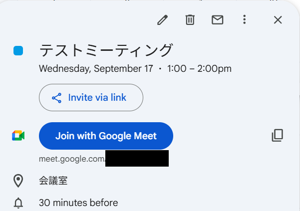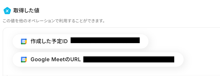 取得した値に、自動作成されたGoogleカレンダーの予定とGoogle MeetのURLが表示されていれば成功です!
