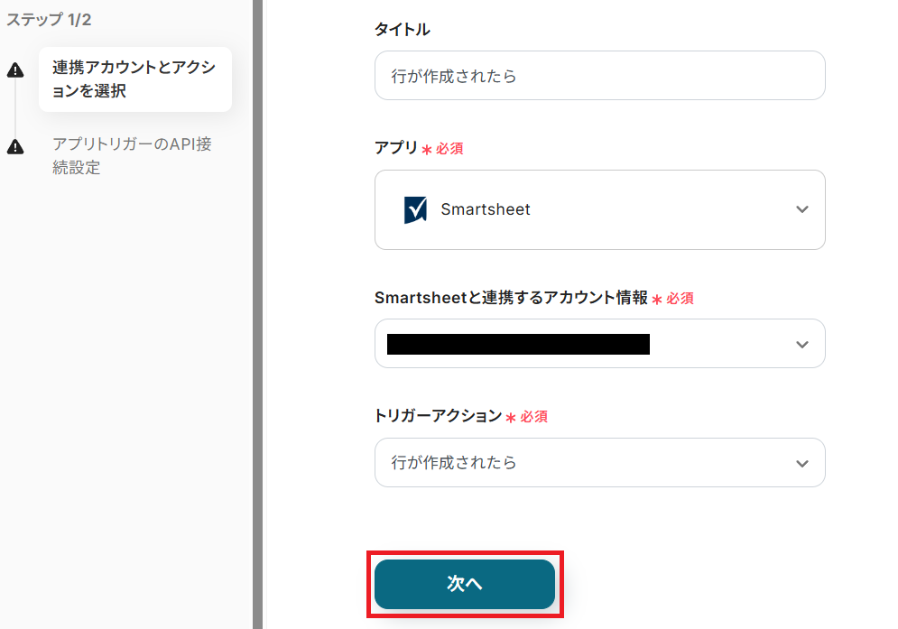 タイトルを任意で設定し、Smartsheetと連携するアカウントやアクション内容を確認したら「次へ」を押してください。