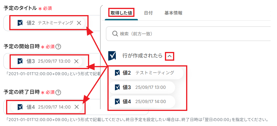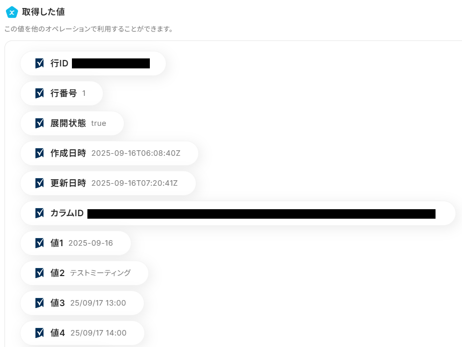 「取得した値」として、Smartsheetに追加された行の内容が表示されていれば成功です!