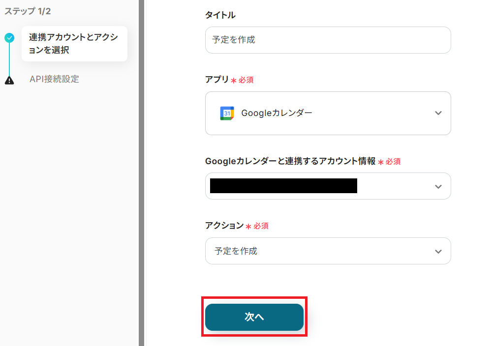 タイトルを任意で設定し、Googleカレンダーと連携するアカウントやアクション内容を確認したら「次へ」を押してください。