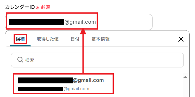 「カレンダーID」には、候補の中から自分のGoogleアカウントのメールアドレスを選択してください。