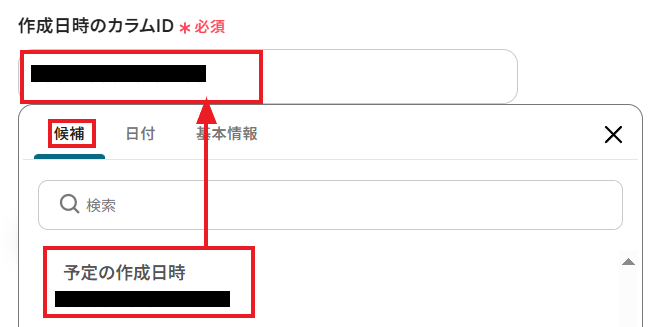 次に設定する「作成日時のカラムID」も、候補の中から選択してください。