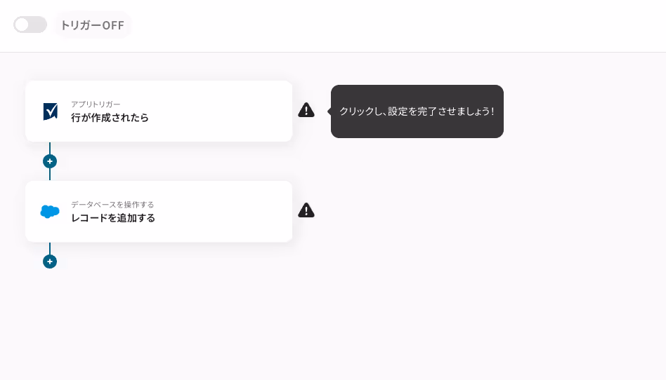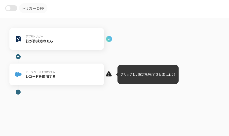 ・Salesforceはチームプラン・サクセスプランでのみご利用いただけるアプリとなっております。フリープラン・ミニプランの場合は設定しているフローボットのオペレーションやデータコネクトはエラーとなりますので、ご注意ください。