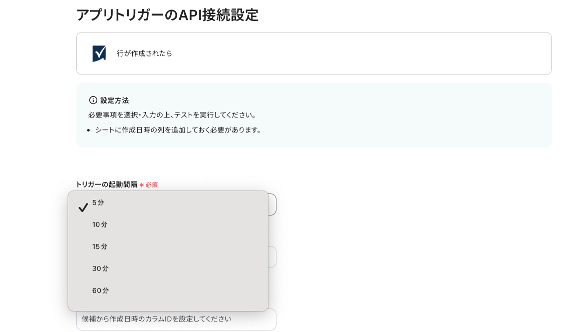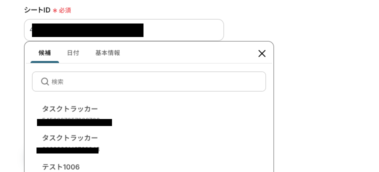 「シートID」と「作成日時のカラムID」は、入力バーをクリックすると『候補』に連携したアカウントに基づいた情報が表示されます。ここから該当するものを選択しましょう。
