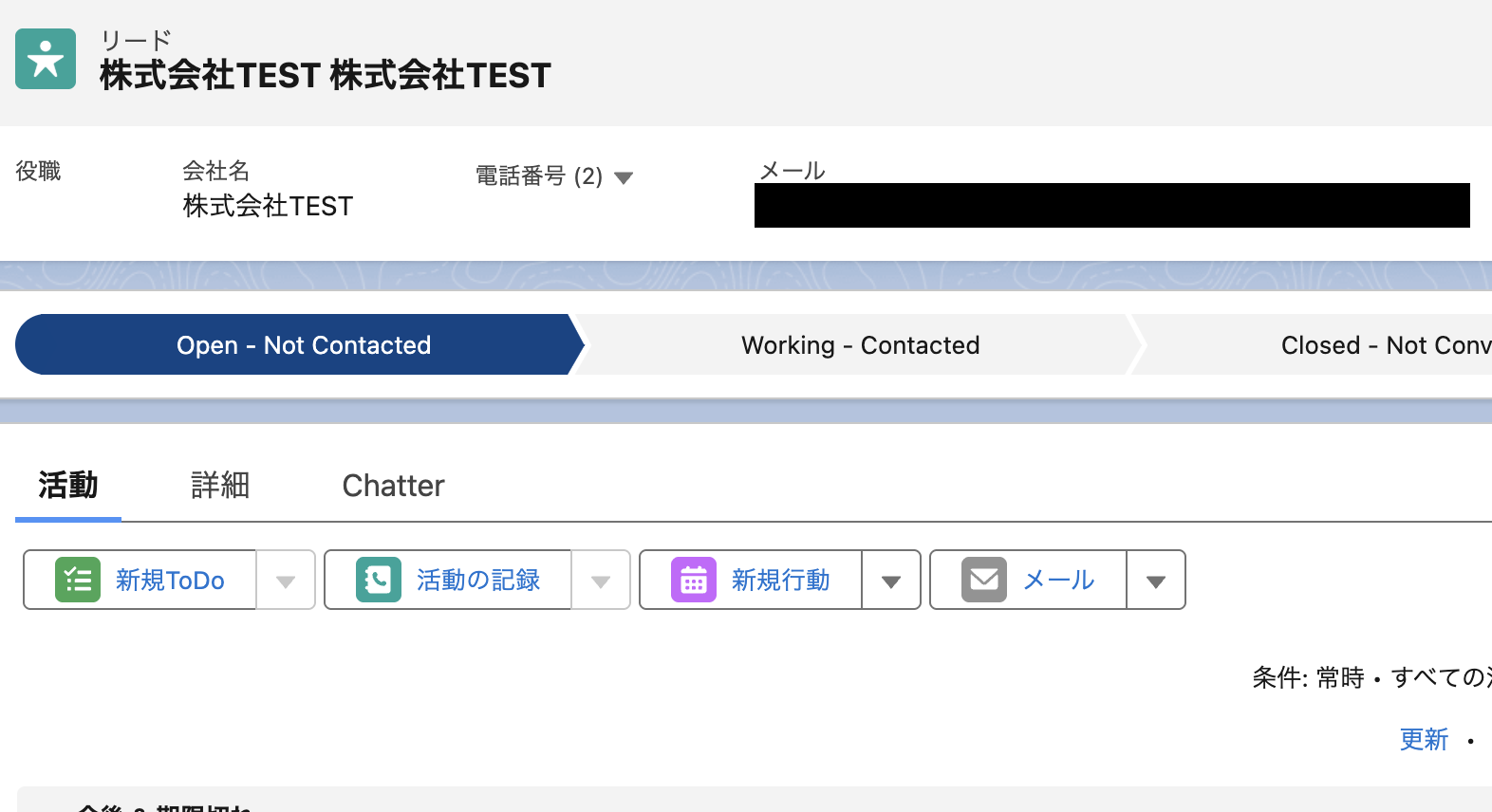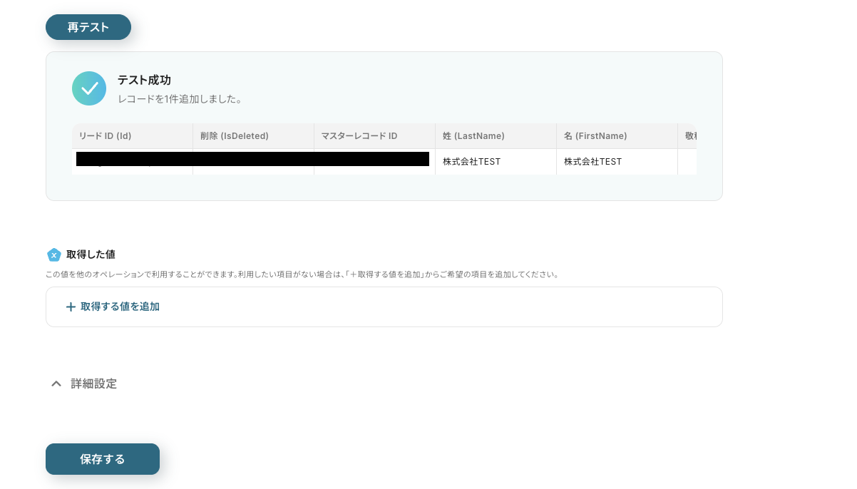 テストに成功すると、以下のように表示されて実際にSalesforceに情報が追加されます。