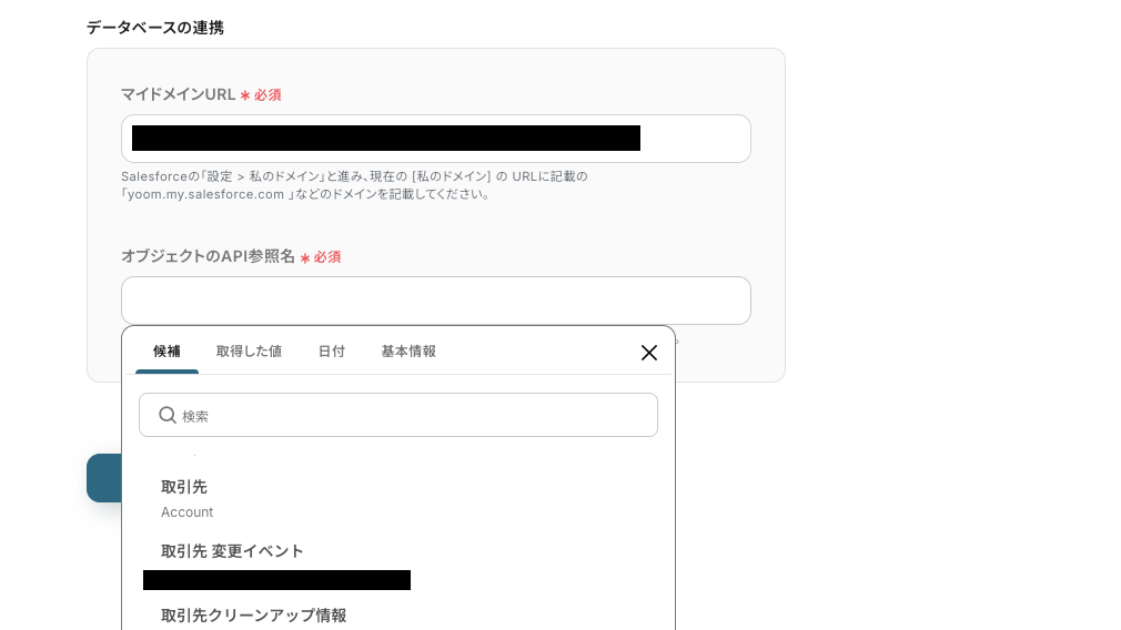 「オブジェクトのAPI参照名」は以下の画像のように、連携したアカウントに基づいた情報が『候補』に展開されるので、こちらからレコード情報を追加したいタグを選択しましょう。