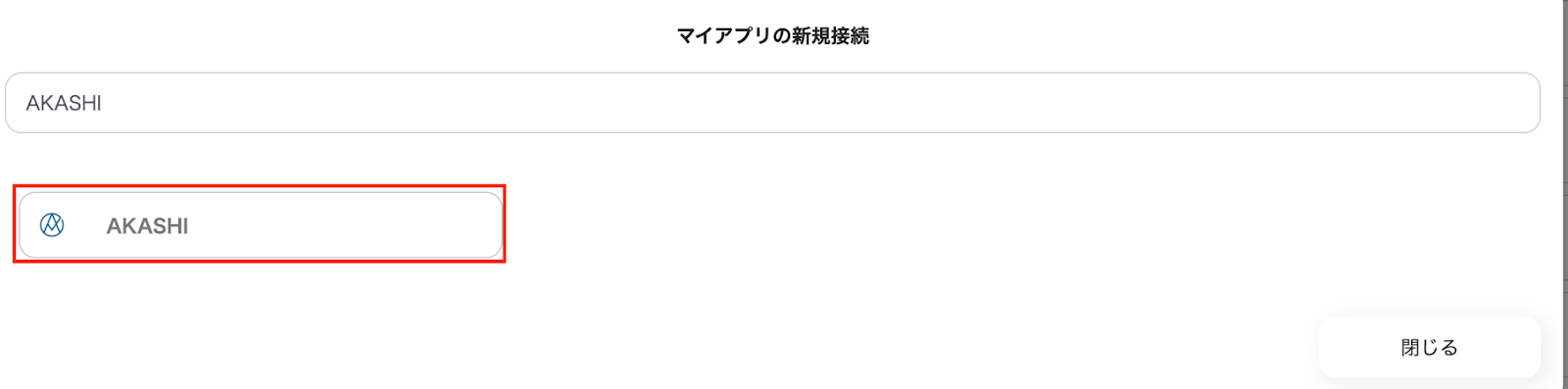 マイアプリの新規接続の画面で、AKASHIを検索してアプリ名をクリックしましょう。