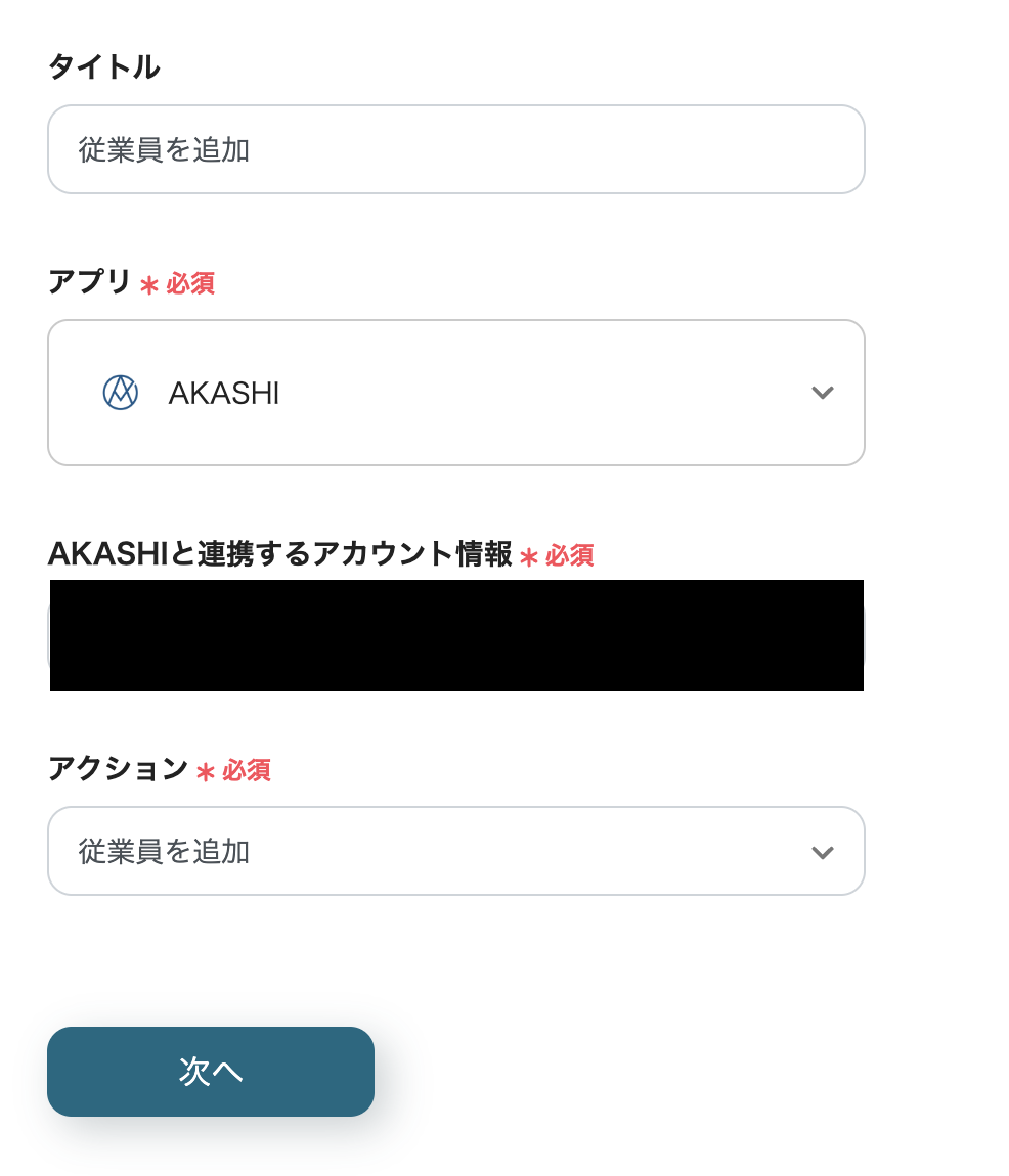 ・AKASHIと連携するアカウント情報を確認し「次へ」をクリックしましょう。