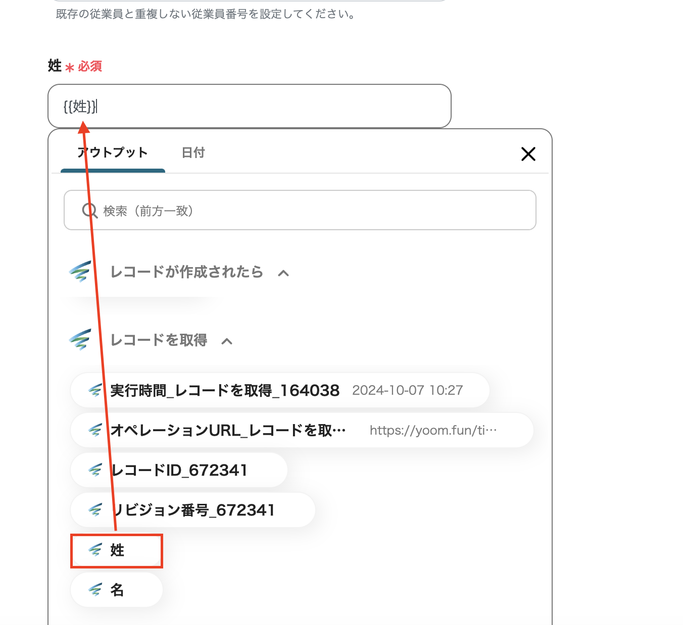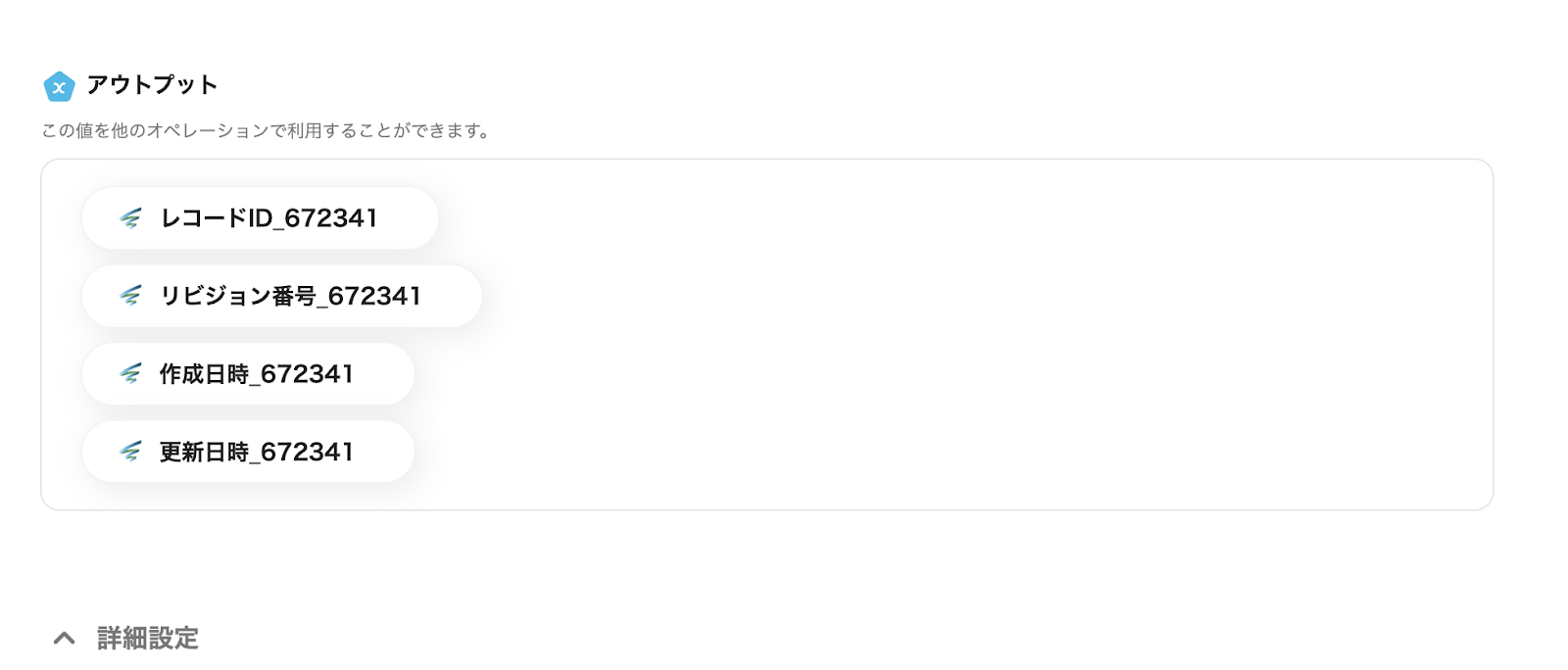 ・レコード情報の値をアウトプットとして追加する際に、手動操作が必要です。