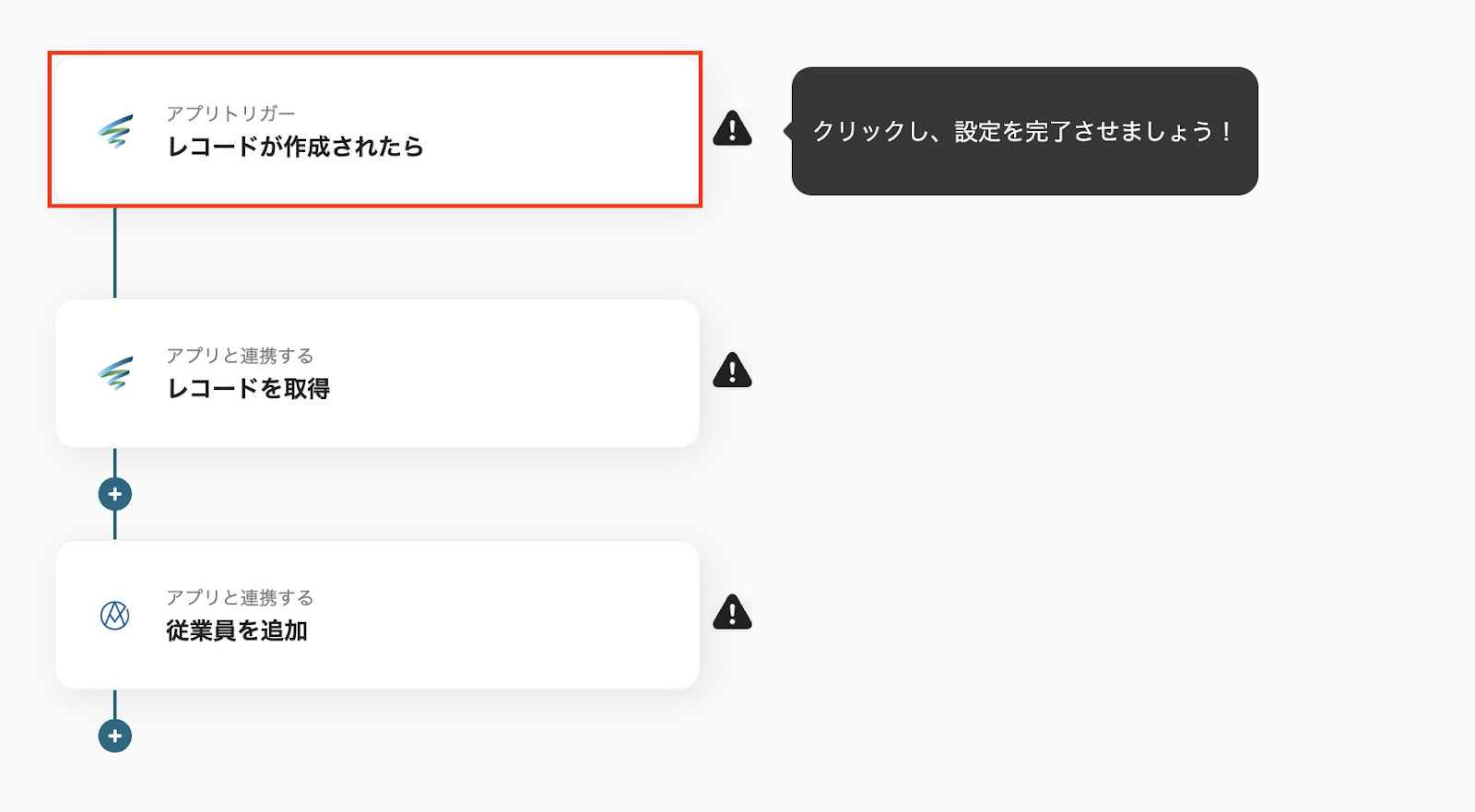 それでは「SPIRALで従業員情報が登録されたらAKASHIにも登録する」のフローボット作成方法を、Yoomの作成画面を交えて説明します。