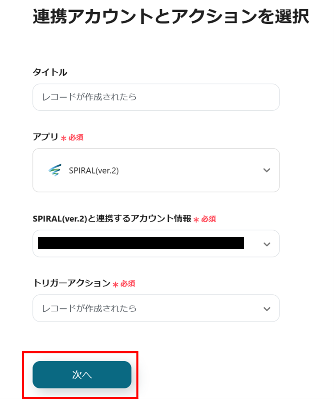 (2)SPIRALの「連携アカウントとアクションを選択」画面から、SPIRAL(ver.2)と連携するアカウント情報に誤りがないかを確認し、トリガーアクションは「レコードが作成されたら」のままで「次へ」をクリックします。