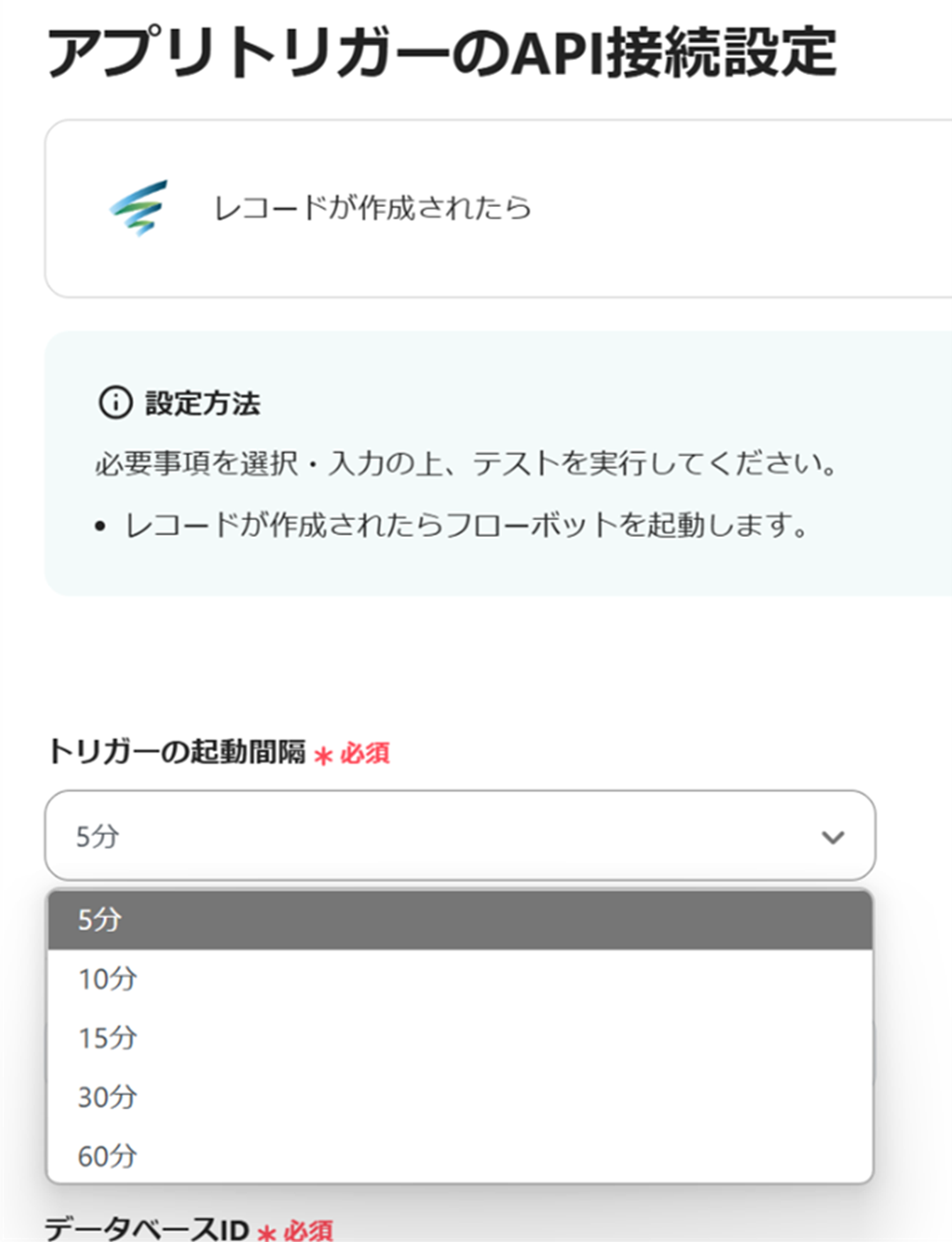 (3)「アプリトリガーのAPI接続設定」画面から、トリガーの起動間隔をプルダウンより選択します。