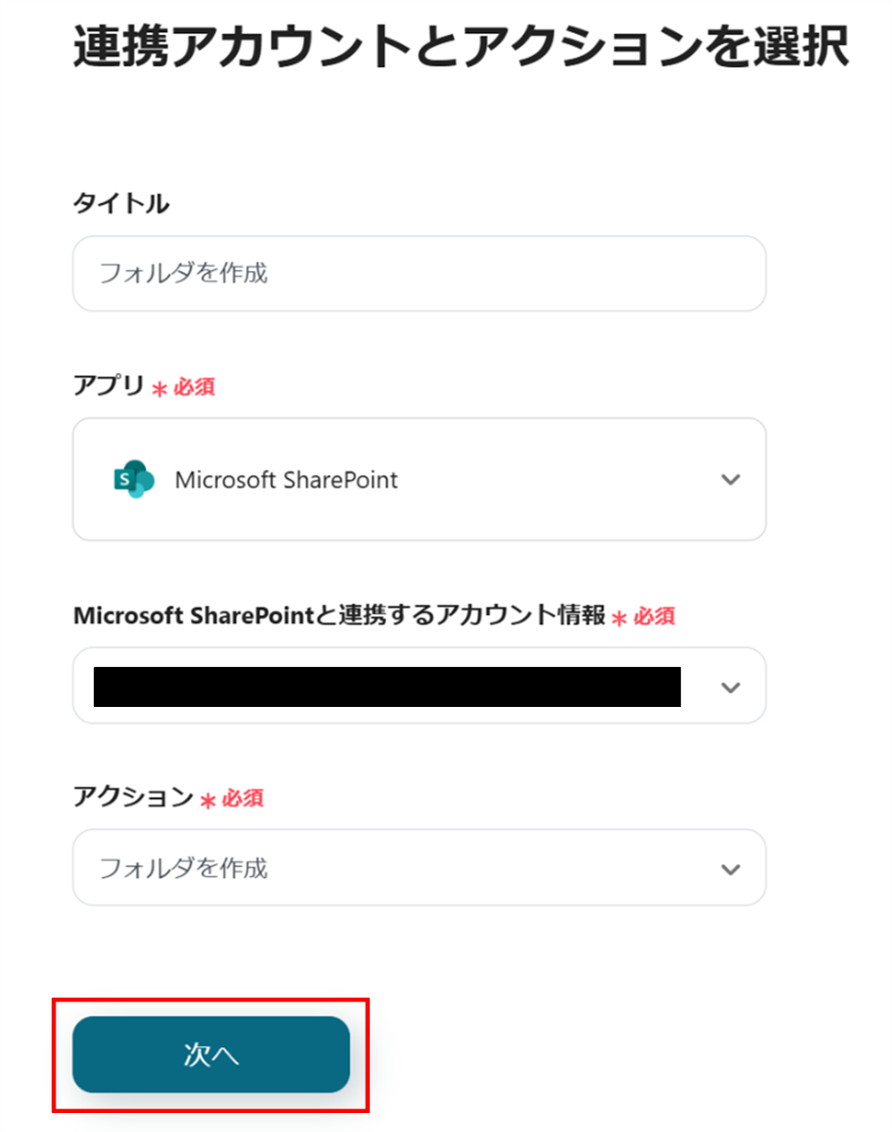 (2)Microsoft SharePointの「連携アカウントとアクションを選択」画面から、Microsoft SharePointと連携するアカウント情報に誤りがないかを確認し、アクションは「フォルダを作成」のままで「次へ」をクリックします。