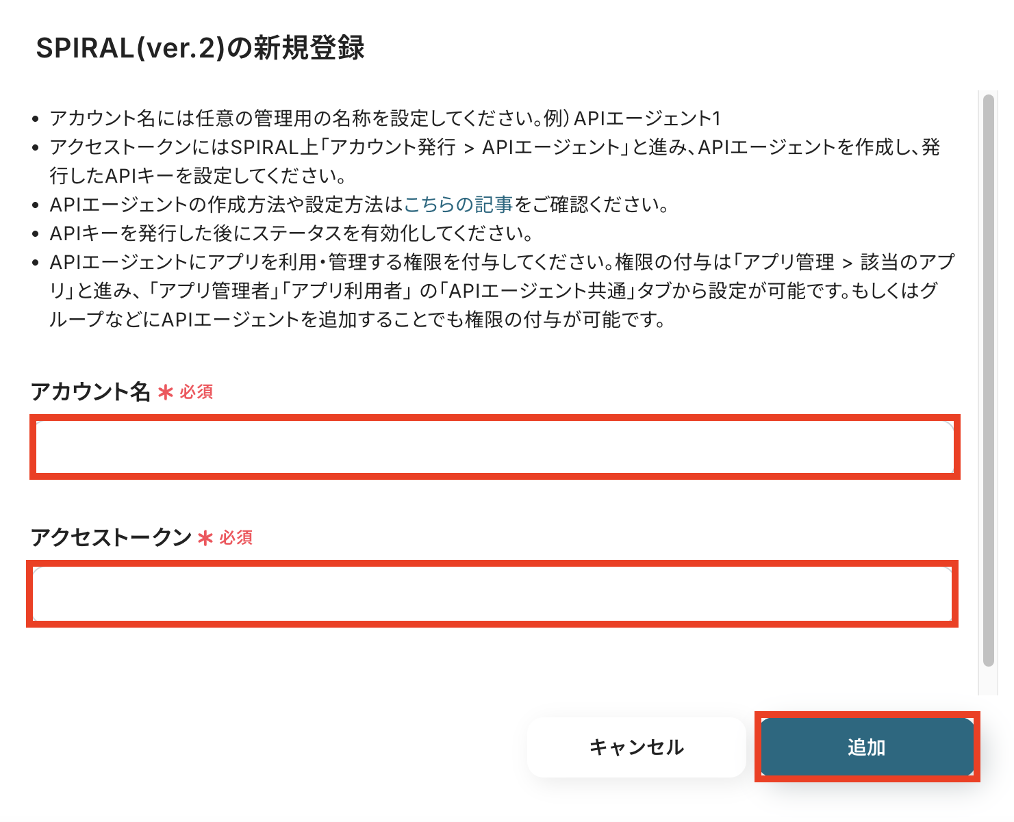 「SPIRALと連携するアカウント情報」:合っているか確認