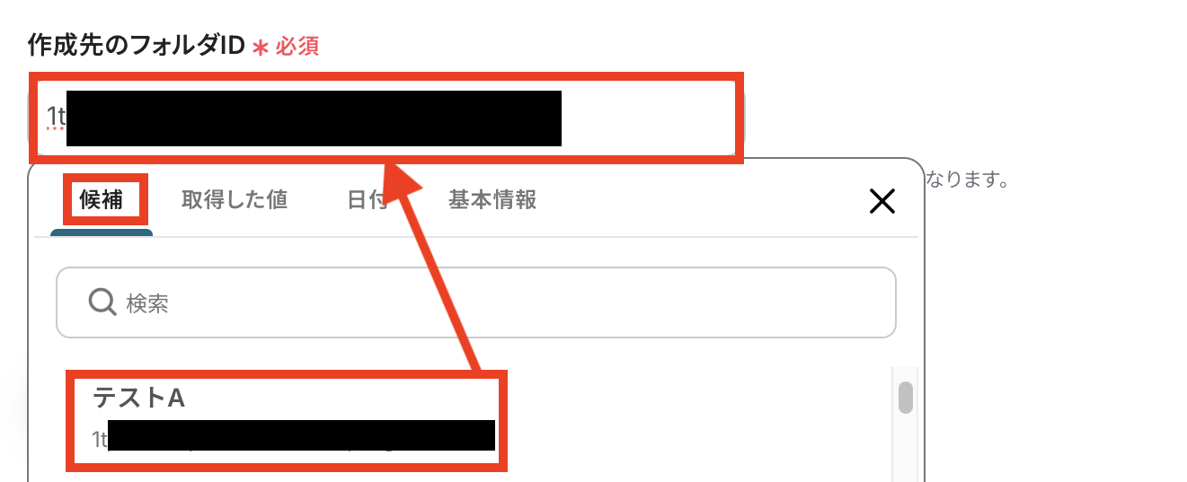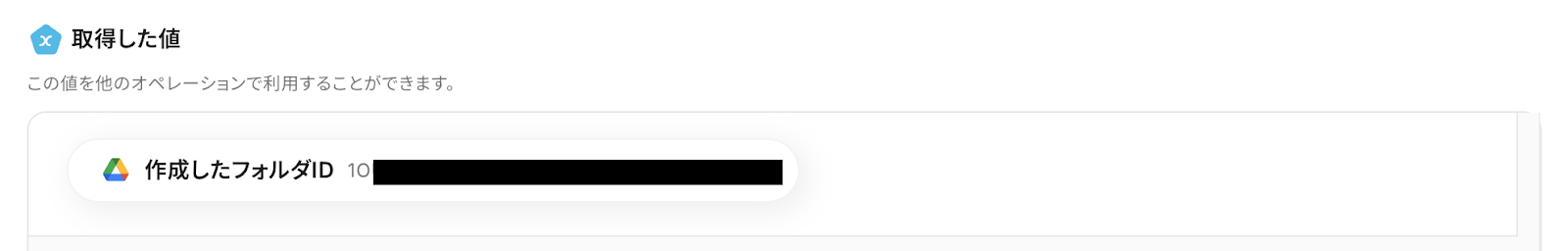 入力完了後「テスト」をクリックして「取得した値」としてフォルダIDが表示されていればテスト成功です。