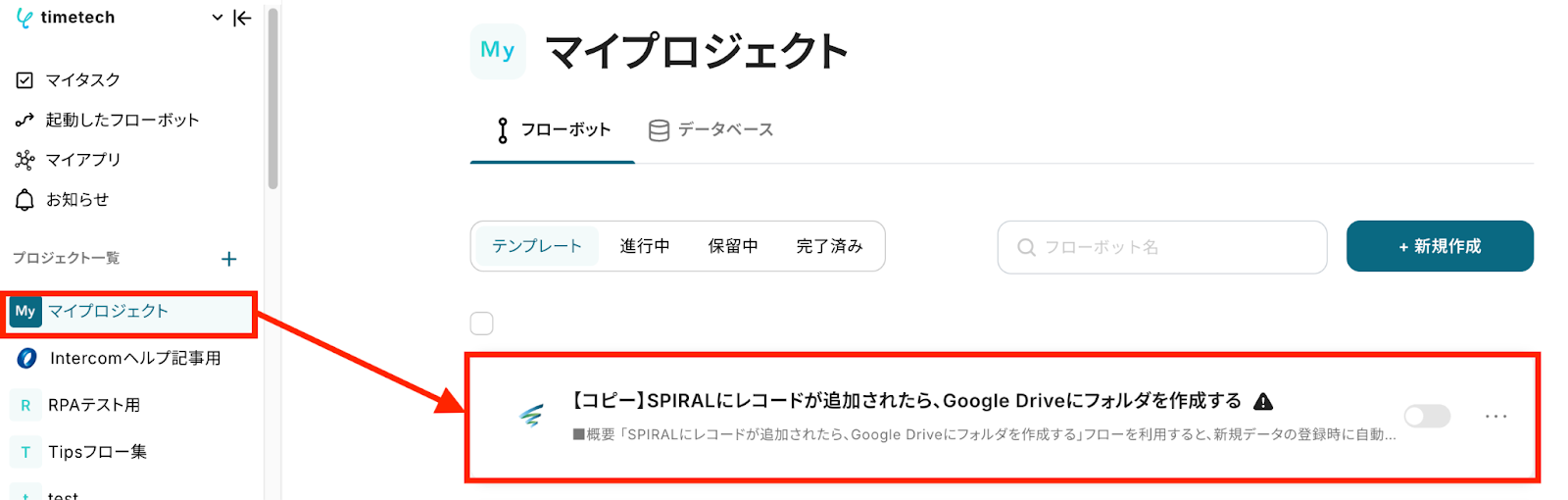 左側にあるメニューの「マイプロジェクト」から、コピーしたテンプレートを開きます。