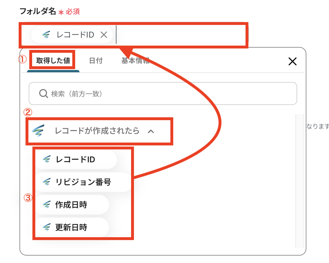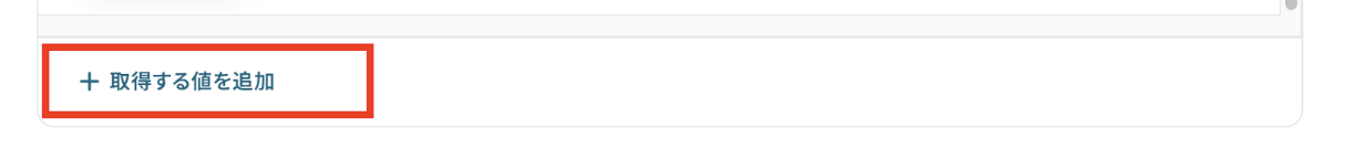 もし、Google Driveのフォルダを作成する際に使用する「フォルダ名」として、使用したいデータが反映されていない場合は「取得する値を追加」をクリックして、データを追加することも可能です。