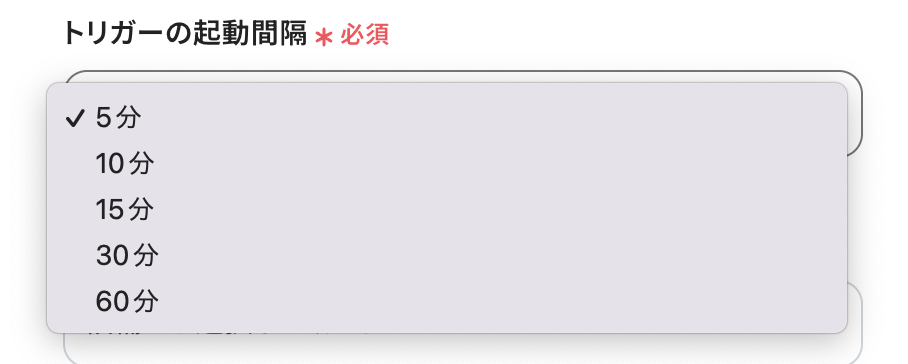 「トリガーの起動間隔」を5分・10分・15分・30分・60分から選択します。