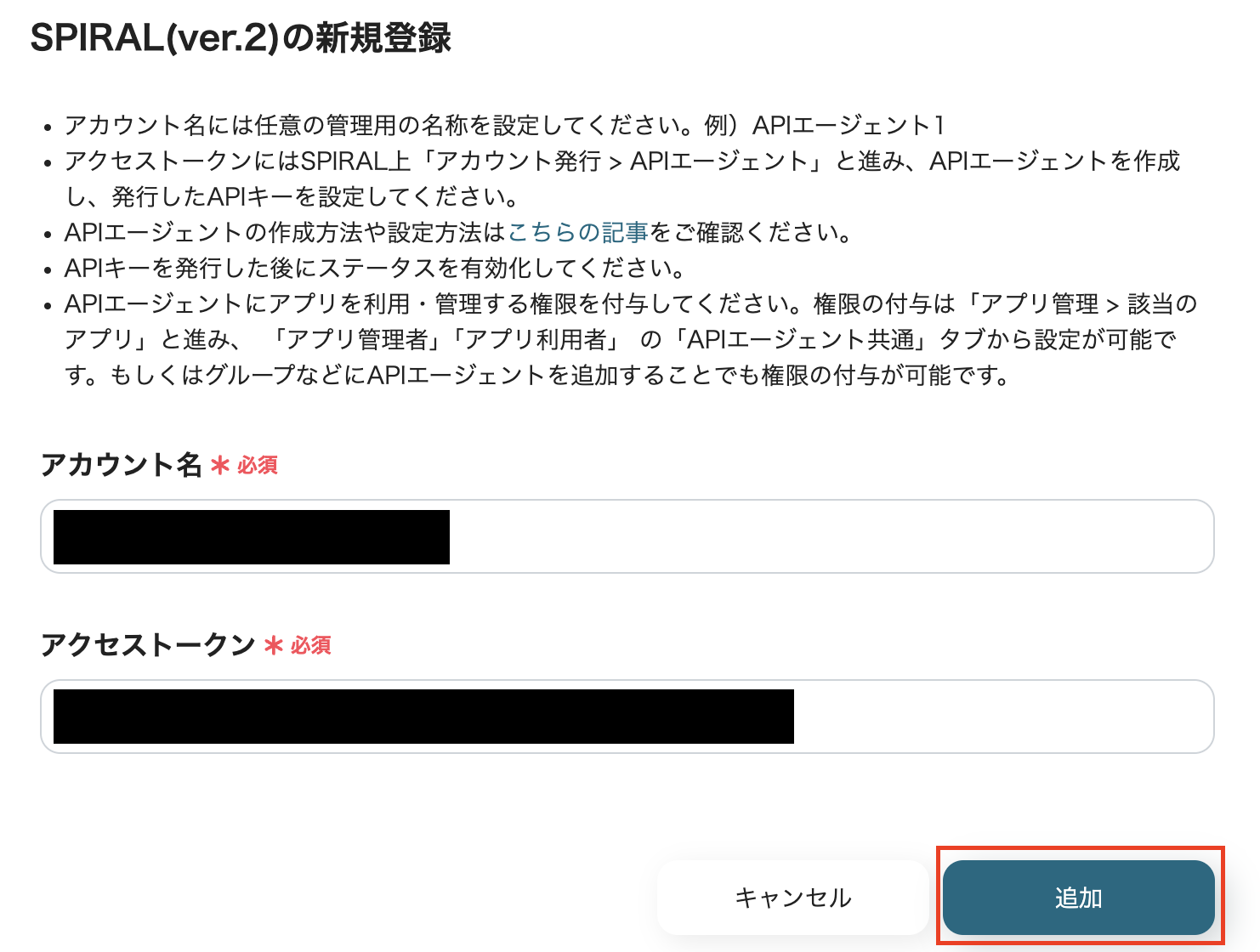「アカウント名」と「アクセストークン」を入力後に「追加」をクリックします。