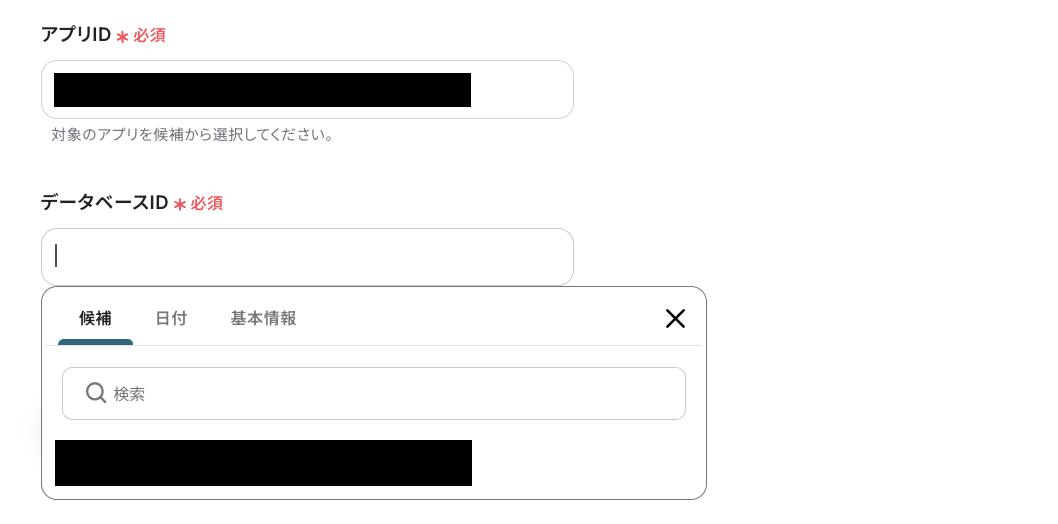 「アプリID」と「データベースID」は、連携したアカウントから情報を抽出しており、入力バーをクリックすると『候補』にその内容が表示されます。