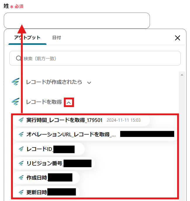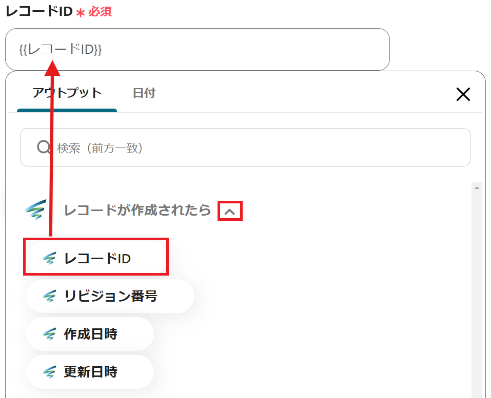 「レコードが作成されたら」のアウトプットを使用して設定してください。
