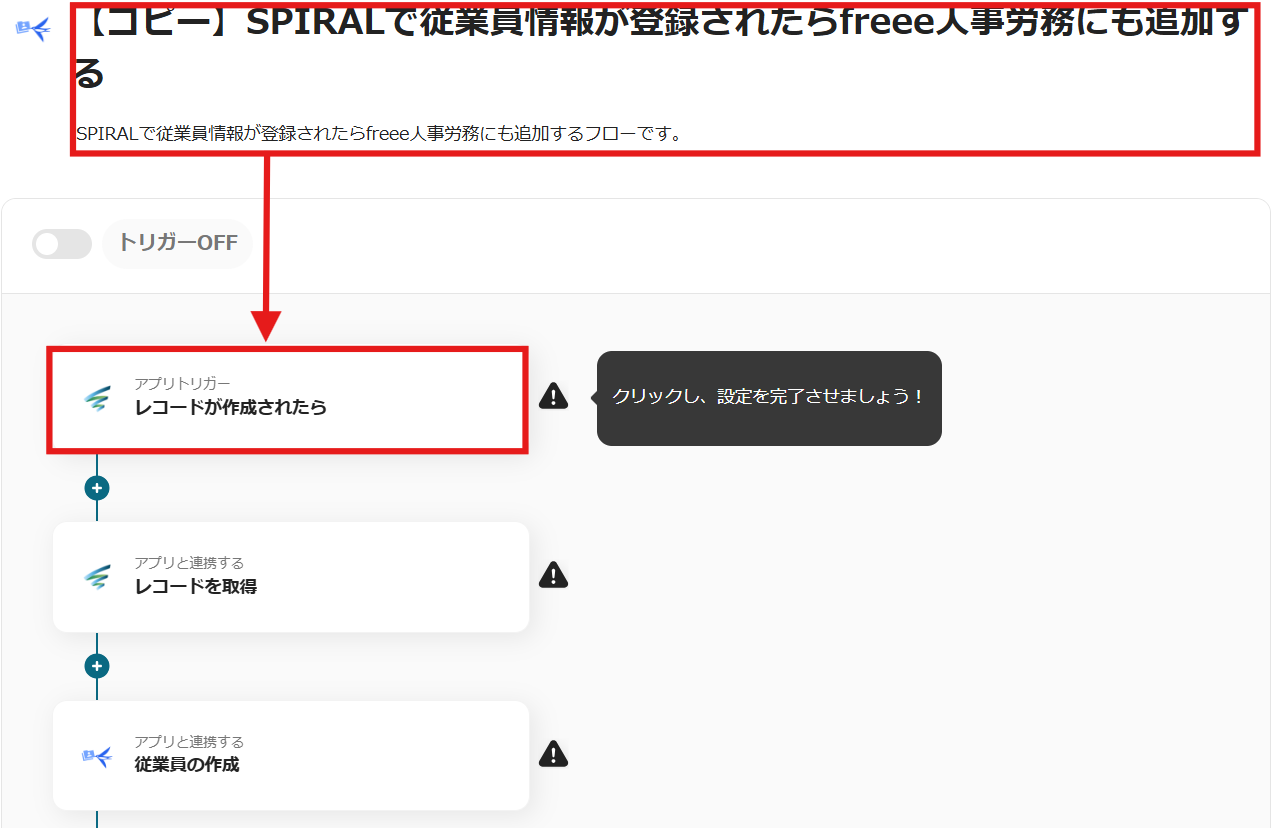 最初にSPIRALの設定から行うため、「レコードが作成されたら」をクリックしましょう。