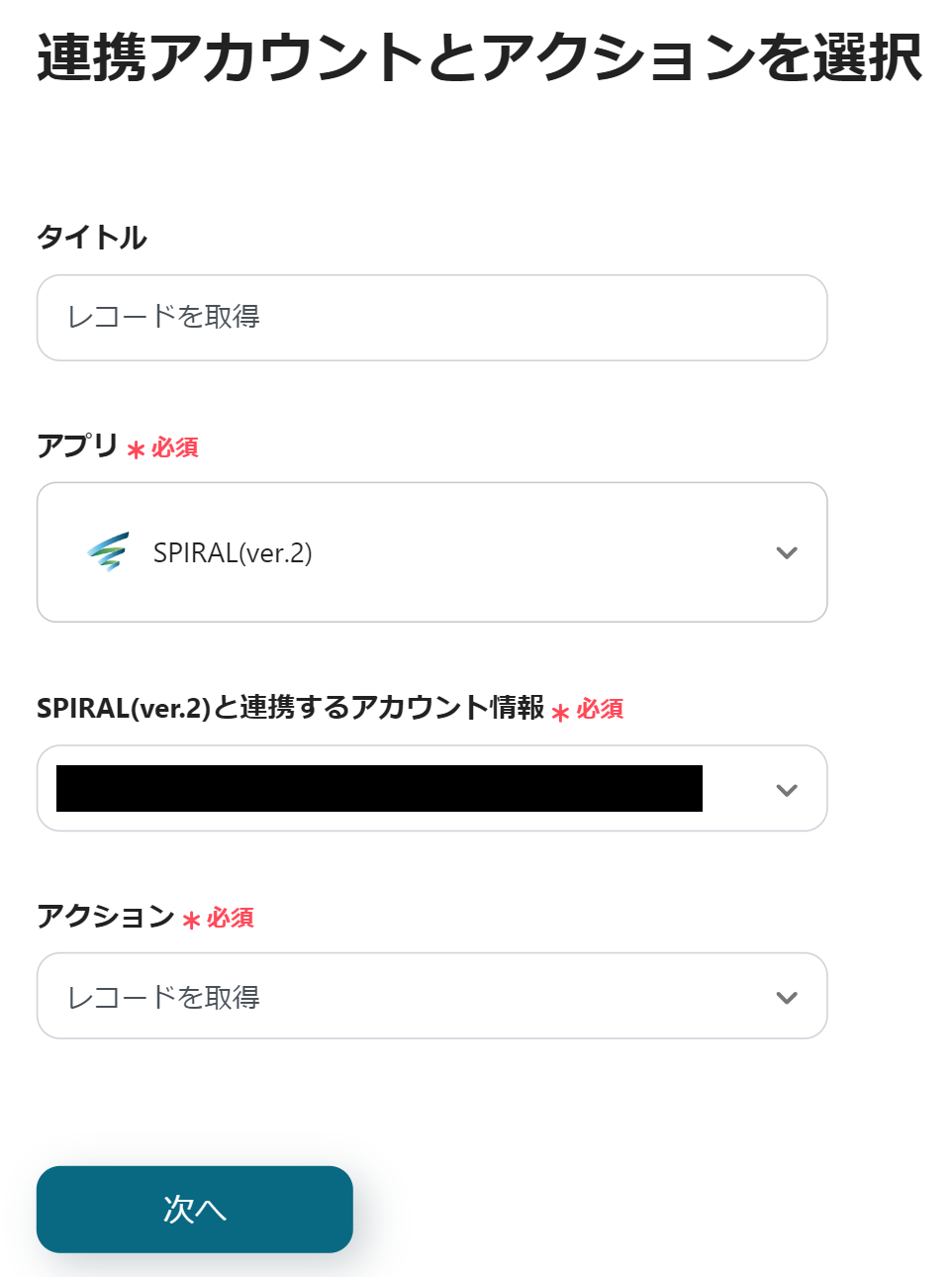 続いて、SPIRALでレコードを取得する設定を行うので、「レコードを取得」をクリックします。