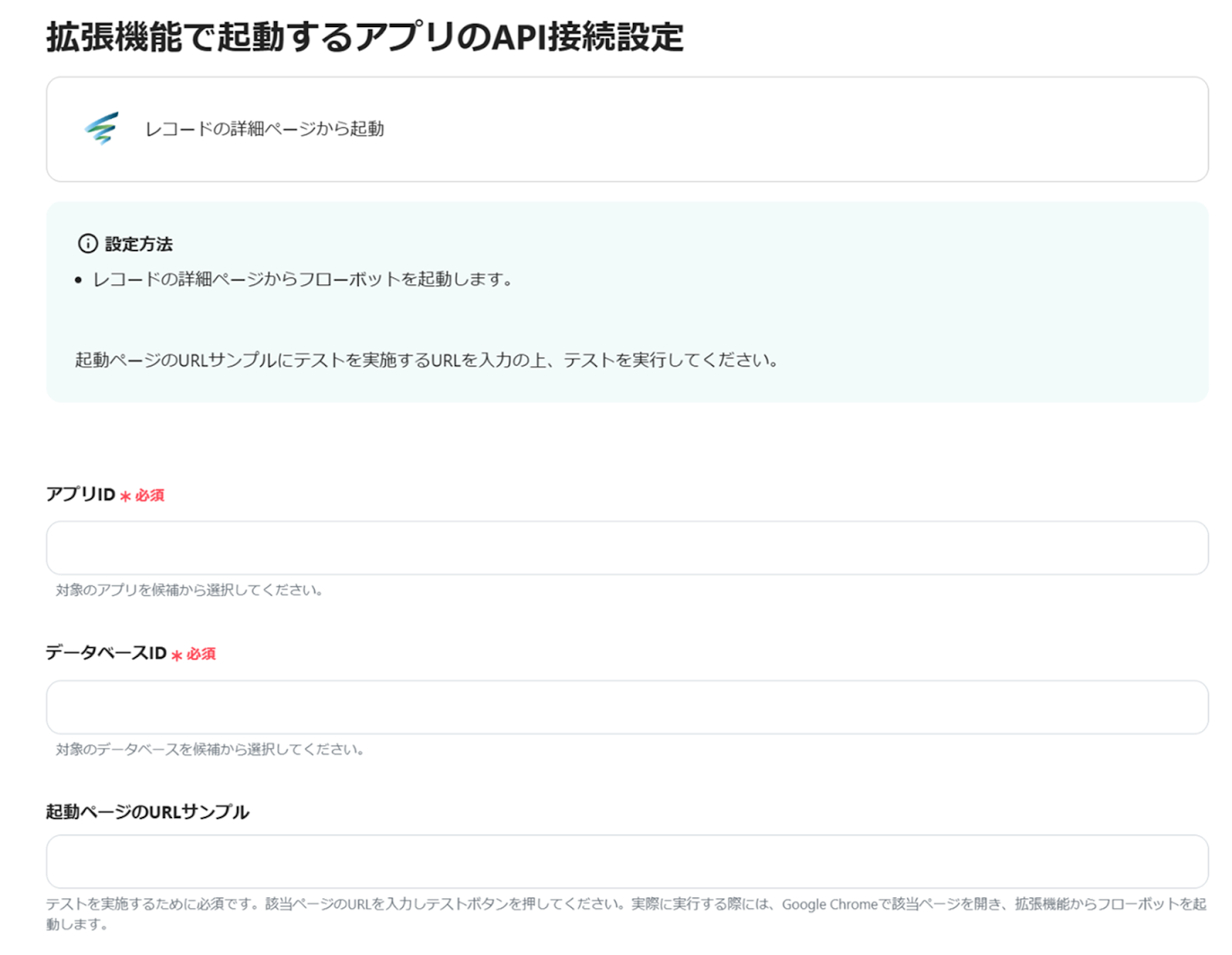 (3)「拡張機能で起動するアプリのAPI接続設定」画面から、アプリID、データベースIDを候補から選択します。起動ページのURLサンプルはテストを実施する場合は入力をしてください。