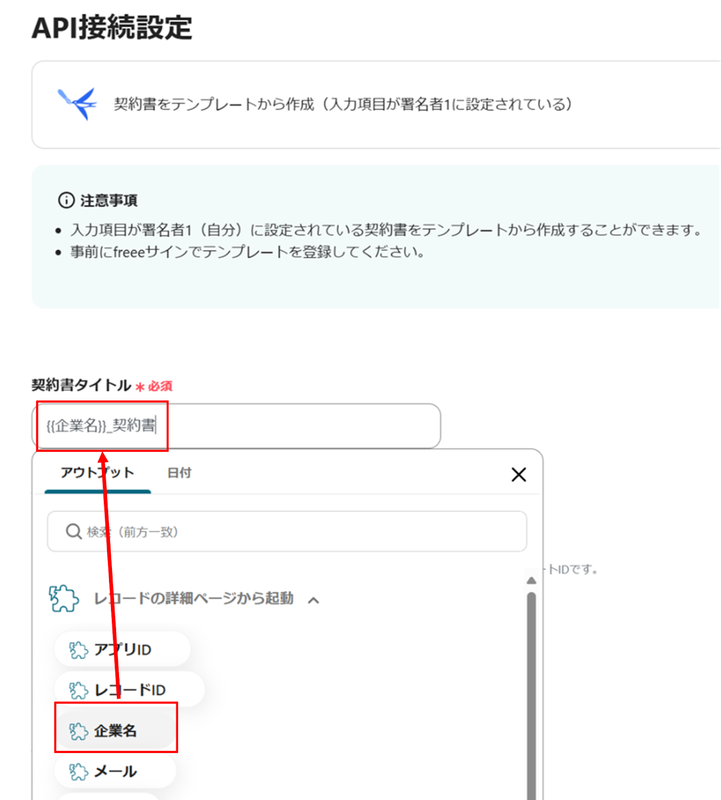 ・契約書タイトル:アウトプットから選択(今回のように「企業名+固定文字」とすることも可能)