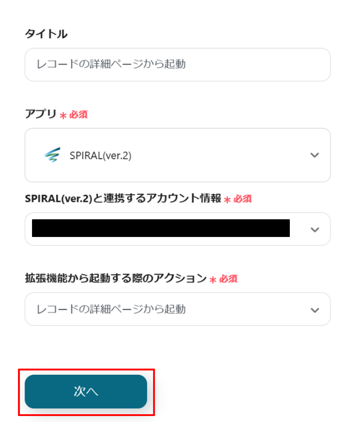 (2)SPIRALの「拡張機能で起動するアプリの連携アカウントとアクションを選択」画面から、SPIRALと連携するアカウント情報に誤りがないかを確認し、拡張機能から起動する際のアクションは「レコードの詳細ページから起動」のままで「次へ」をクリックします。