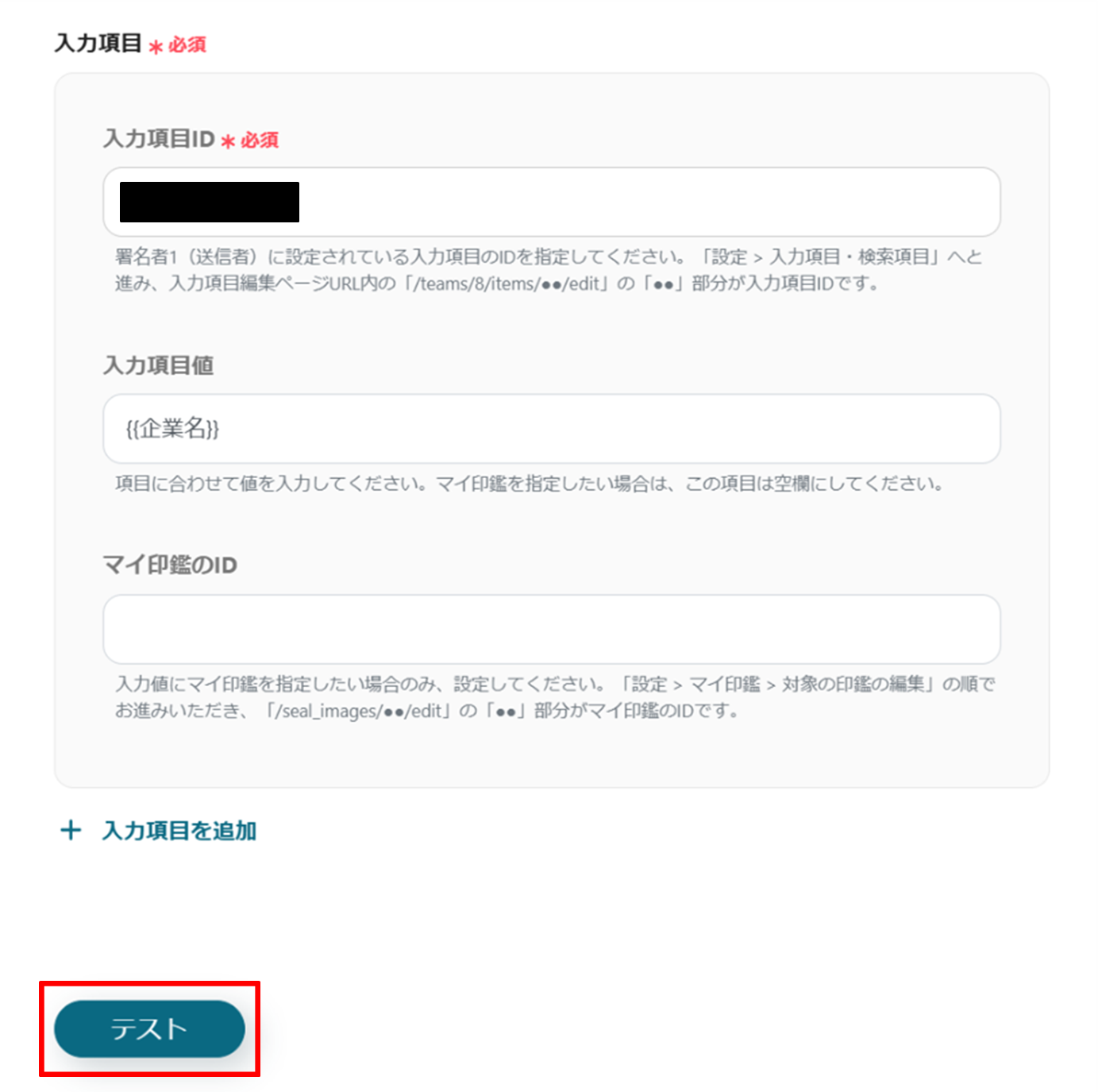 下へ進み、入力項目IDを候補から選択します。