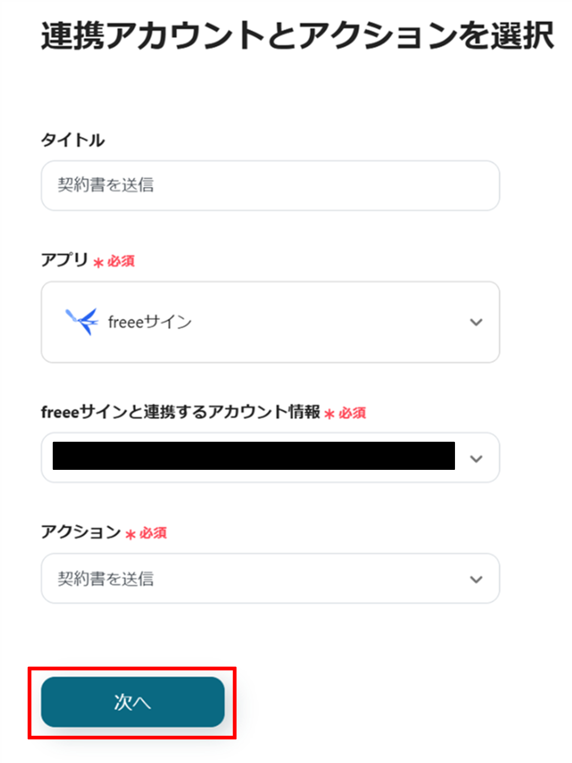 (2)freeeサイン「連携アカウントとアクションを選択」画面から、freeeサインと連携するアカウント情報に誤りがないかを確認し、アクションは「契約書を送信」のままで「次へ」をクリックします。