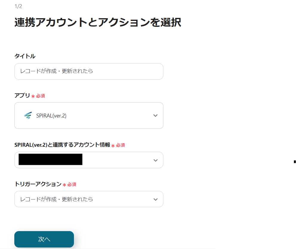 1) アクションは「レコードが作成・更新されたら」を選択して、「次へ」をクリックします。