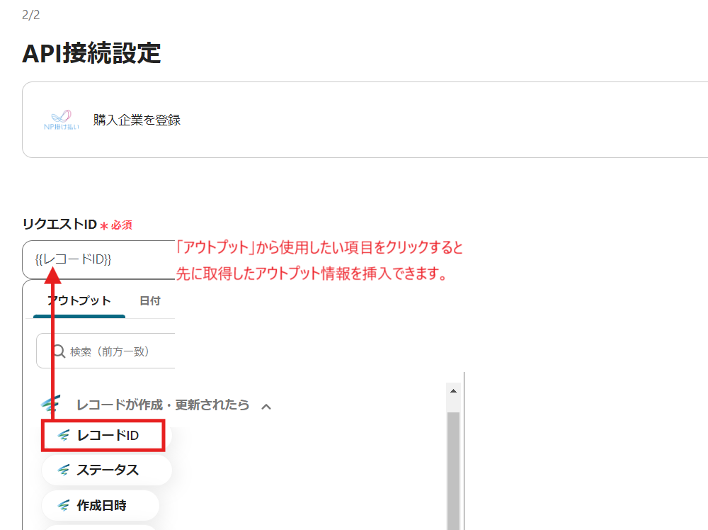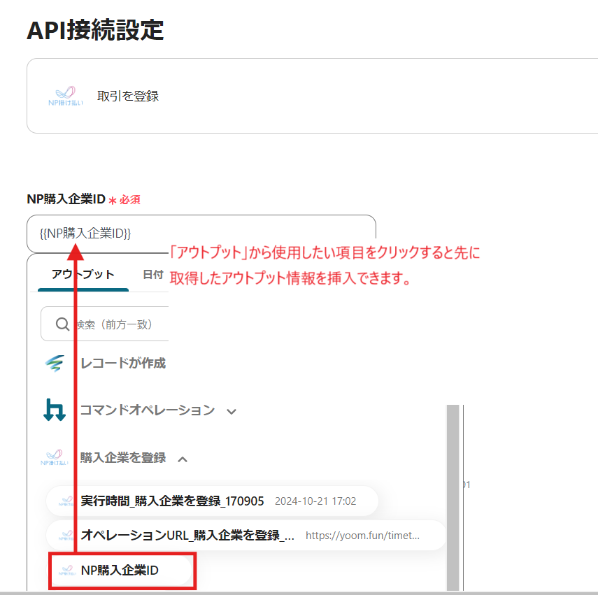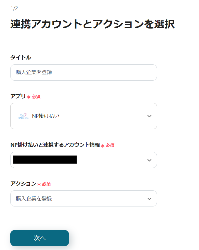 ・その後、NP掛け払いで「購入企業を登録」というアクションを設定