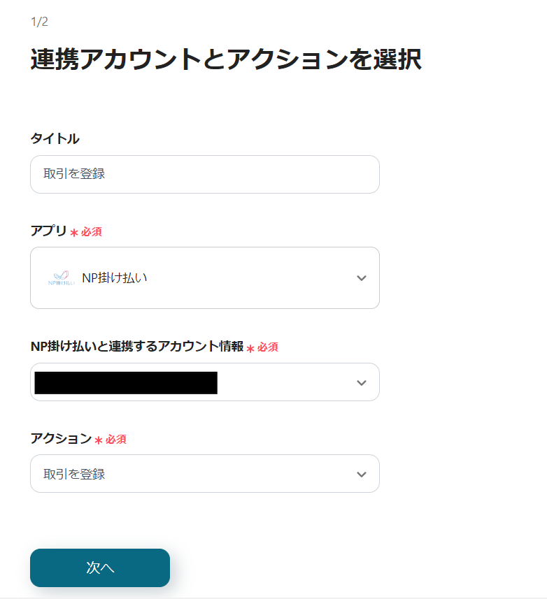 2) アクションは「取引を登録」を選択して、「次へ」をクリックします。