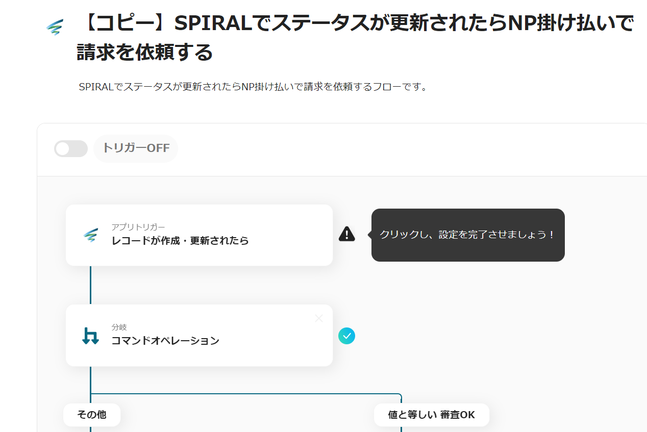 これで【SPIRALでステータスが更新されたらNP掛け払いで請求を依頼する】というフローが完成です。